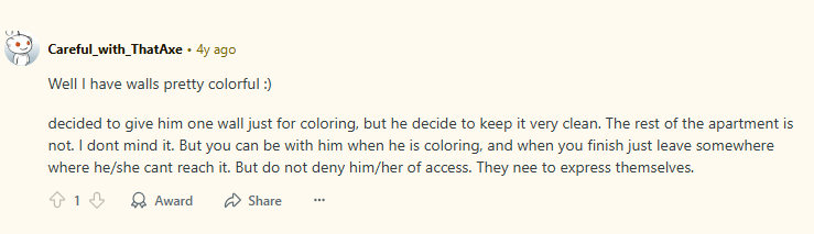 “...decided to give him one wall just for coloring... do not deny him/her of access. They need to express themselves.”