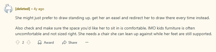 "She might just prefer to draw standing up, get her an easel and redirect her to draw there every time instead... Also check and make sure the space you'd like her to sit in is comfortable."