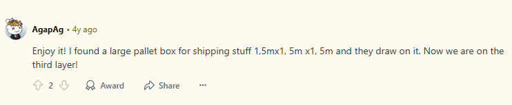 “Enjoy it! I found a large pallet box for shipping stuff 1,5mx1, 5m x1, 5m and they draw on it. Now we are on the third layer!”